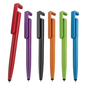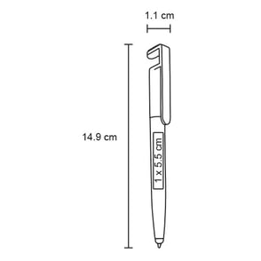 Bolígrafo de plástico, mecanismo retráctil, goma touch screen, limpiador de pantalla y soporte para celular.