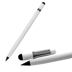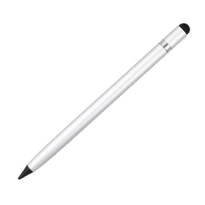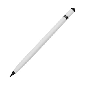 Bolígrafo libre de tinta con goma y touch screen. El trazo gris simula la línea de un lápiz, no deja manchas y es posible borrarlo con una goma regular, la cual está incluída al destapar la parte superior del bolígrafo.