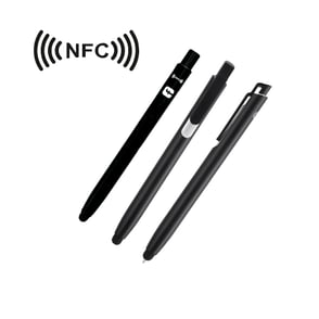 Bolígrafo con etiqueta NFC integrada que puede contener un enlace y es compatible con todos los teléfonos inteligentes NFC. Incluye goma touch screen.