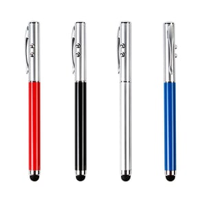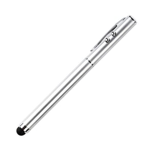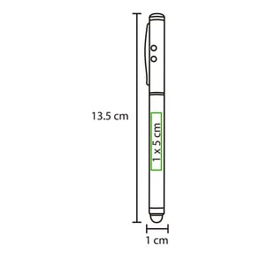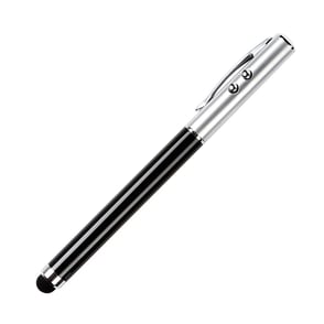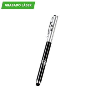 Bolígrafo metálico multifunciones, luz led, señalador láser, puntero touch y tinta negra.
