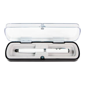 Incluye estuche de plástico con base para fijar bolígrafo, tapa trasparente con imán para cerrar.