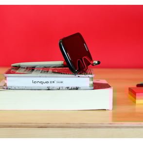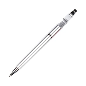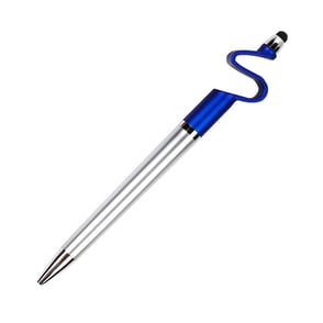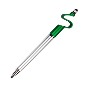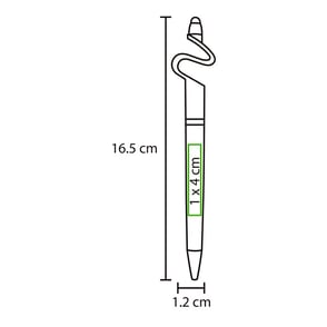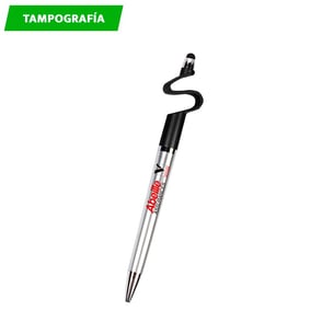 Bolígrafo de plástico con puntero touch y diseño base para celular con tinta negra.