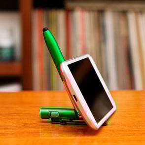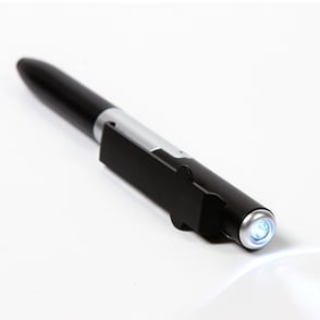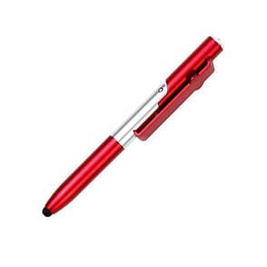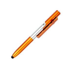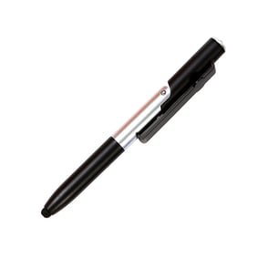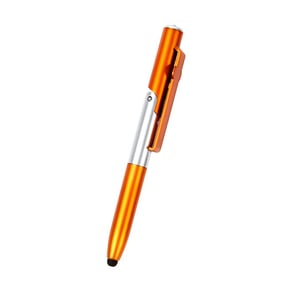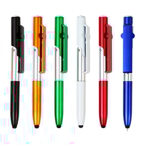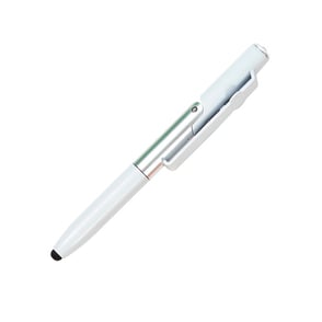 Bolígrafo de plástico con lámpara, puntero touch y diseño base para celular con tinta negra.