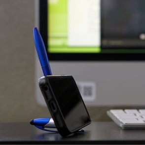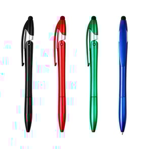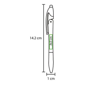 Bolígrafo de plástico con puntero touch y diseño base para celular con tinta negra.