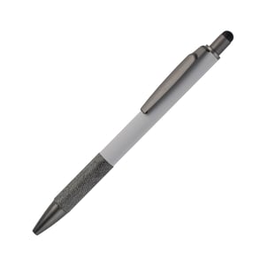 Bolígrafo con barril de aluminio y detalle apariencia piel en la parte inferior, clip y punta metálicos, con touch en la parte superior.