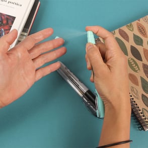 Bolígrafo Antibacterial fabricada en plástico ABS con atomizador y contenedor de 4 ml., para liquido desinfectante, con clip de metal y tinta de gel color negro.