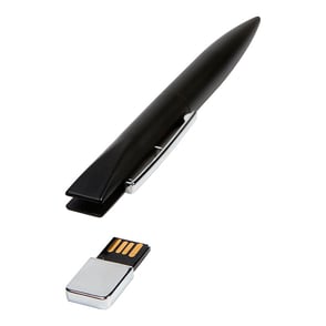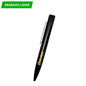 Bolígrafo metálico color negro con acabado Rubber y alma color dorado, memoria USB de 16 GB.