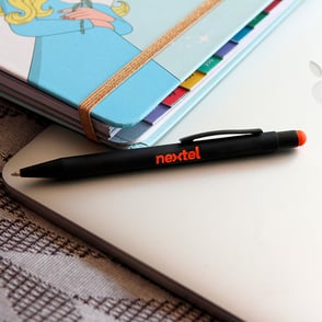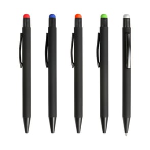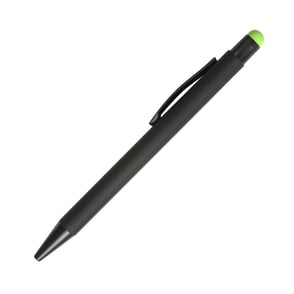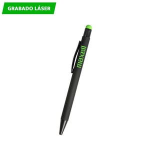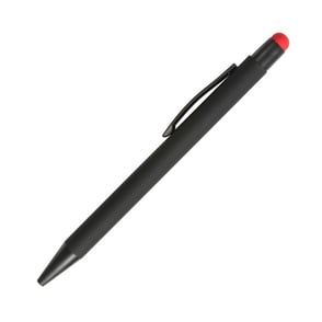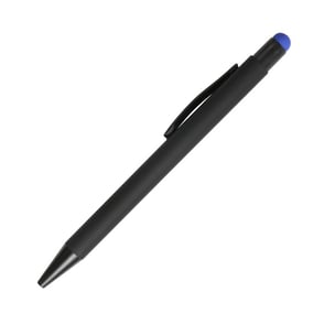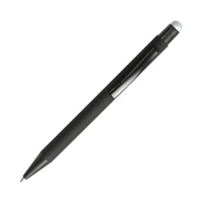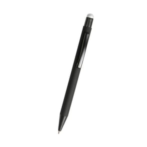 Bolígrafo retráctil fabricado en aluminio terminado Rubber (el grabado destapa en color del puntero touch) con puntero touch, tinta de escritura negra.