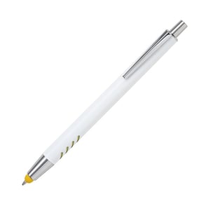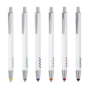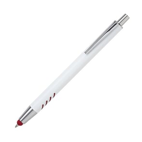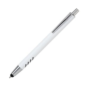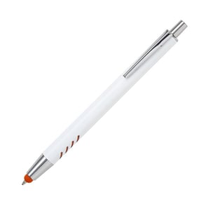 Bolígrafo retráctil con barril de aluminio blanco, botón cromado, puntero touch y detalles de color en el barril, tinta de escritura negra.