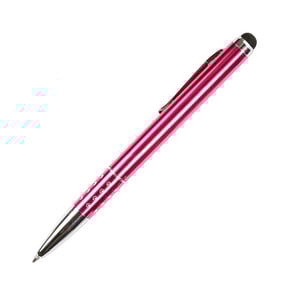 Bolígrafo metálico con puntero touch, clip y punta con acabado metálico, detalle tipo piedra brillante en grip y estuche triangular de plástico transparente.